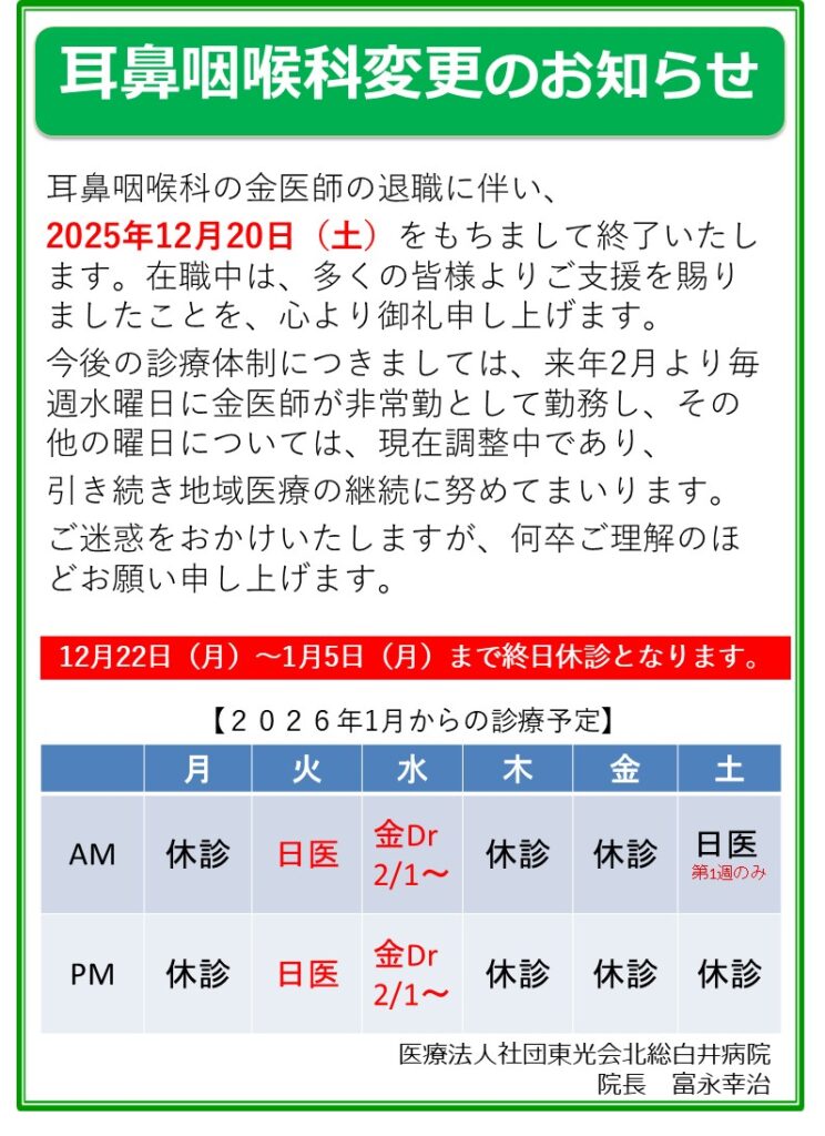 担当医の退職により、下記期間は耳鼻咽喉科を休診とさせていただきます。