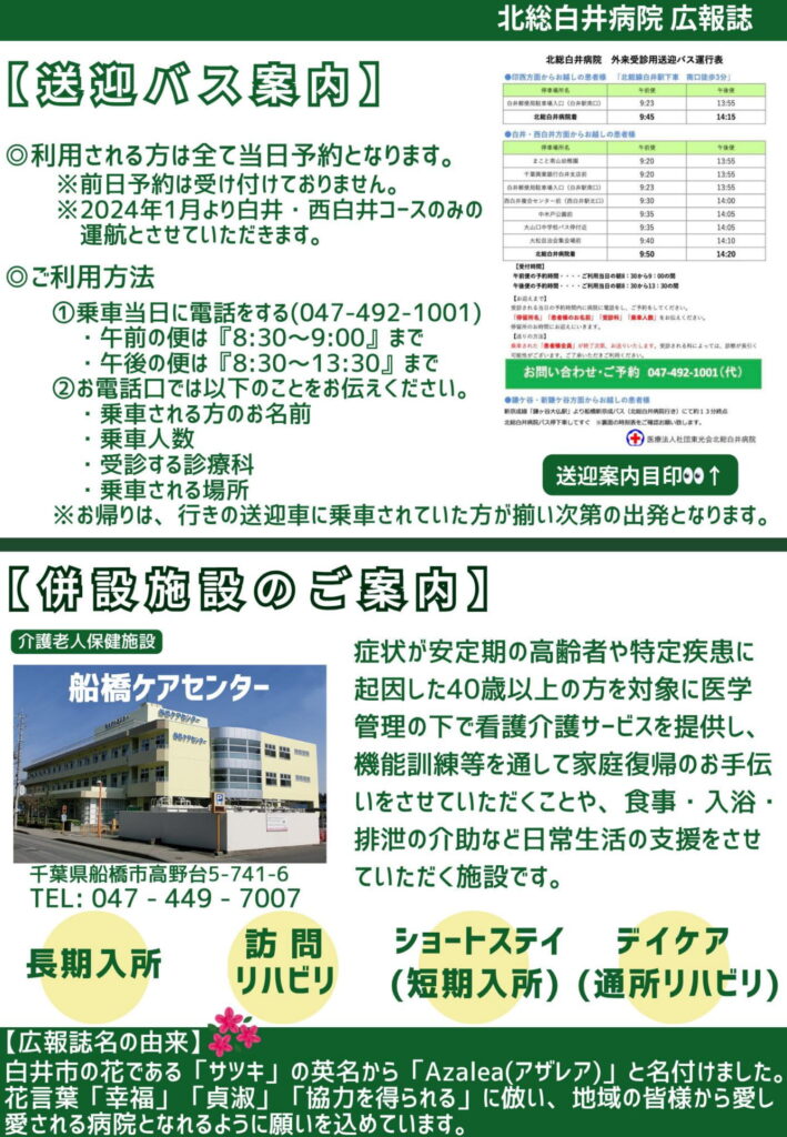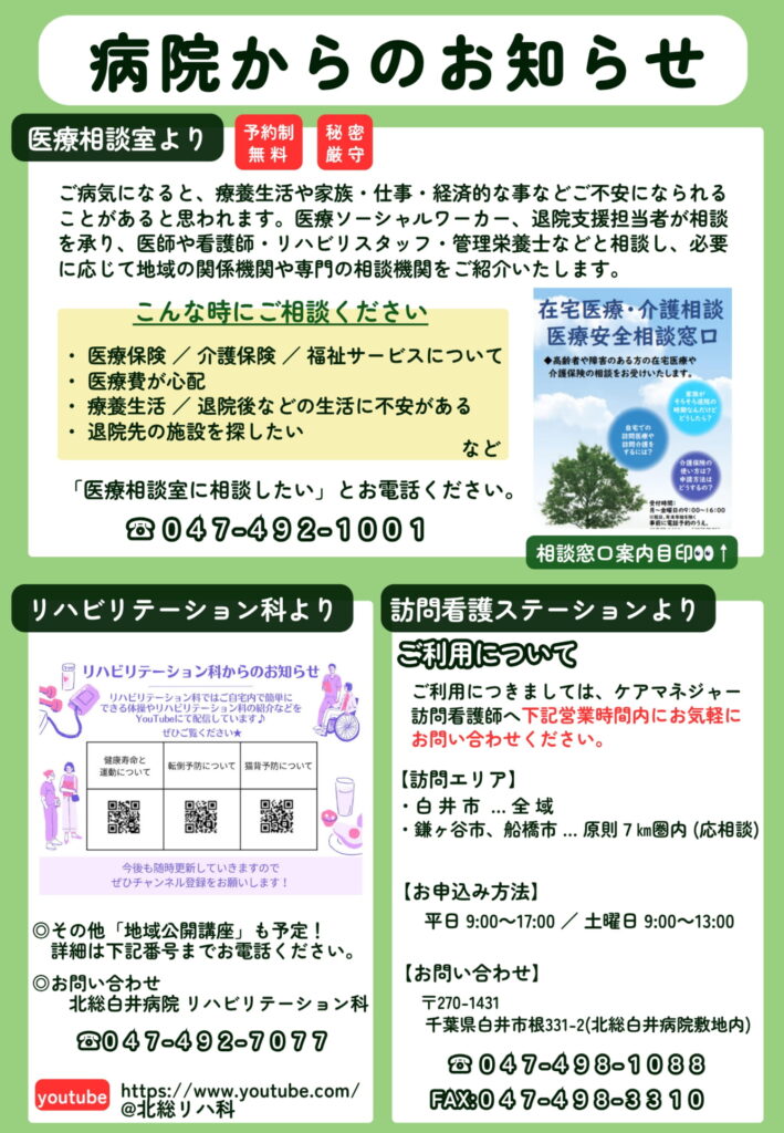 医療法人社団東光会 北総白井病院 ホーム 来院・入院の方 外来案内 初診 再診 入院 面会・お見舞い 当院について ご挨拶・病院概要 病院理念・基本指針・行動方針等 患者の権利と責任 障害者の権利 こどもの権利 外来担当医表 診療科目・部門紹介 施設・サービス フロアマップ 取り組みについて 公開講座情報 看護基準・施設基準 医療関係の方 連携医療機関リスト アクセス・診療時間 病院広報誌について 医療法人社団東光会 北総白井病院 ホーム 来院・入院の方 外来案内 初診 再診 入院 面会・お見舞い 当院について ご挨拶・病院概要 病院理念・基本指針・行動方針等 患者の権利と責任 障害者の権利 こどもの権利 外来担当医表 診療科目・部門紹介 施設・サービス フロアマップ 取り組みについて 公開講座情報 看護基準・施設基準 医療関係の方 連携医療機関リスト アクセス・診療時間 > 病院広報誌について